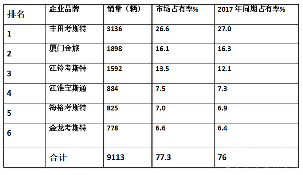 根据上牌数据,2018年前三季度前6名企业考斯特客车销量及市占率%