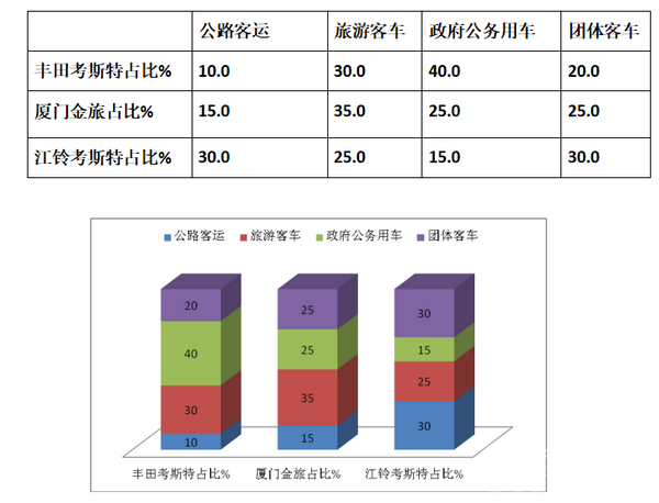 特征六:丰田考斯特在政府公务用车占比最高,厦门金旅在旅客车领域占比最高,江铃考斯特在公路客运领域占比最高