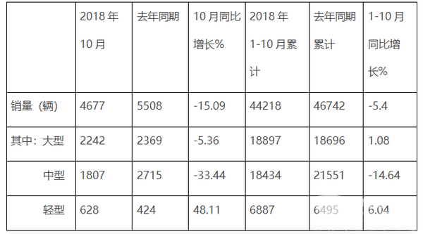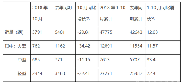 根据中通客车11月7日发布的最新公告,2018年10月及1-10月销量数据如下: