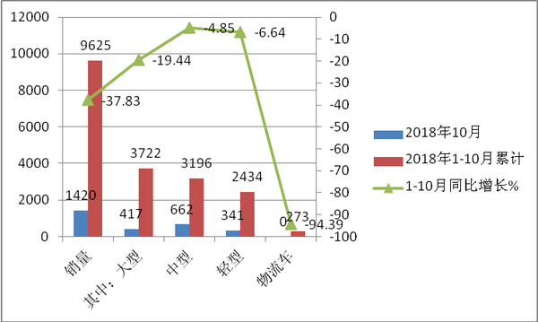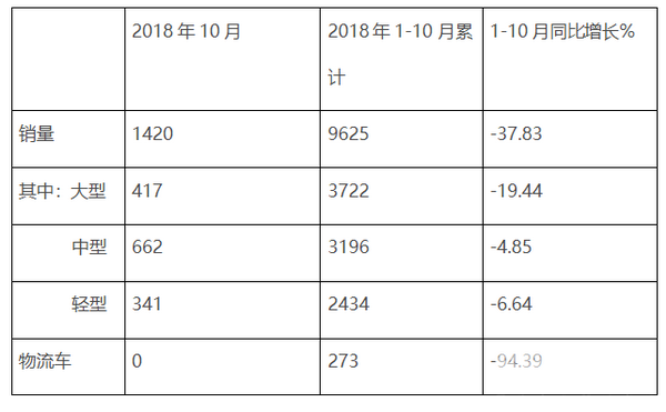 三、累计销量同比大降37.83%,大中轻客车累计销量同比均下滑;物流车销量同比大跌眼镜---2018年前10月中通客车销量点评