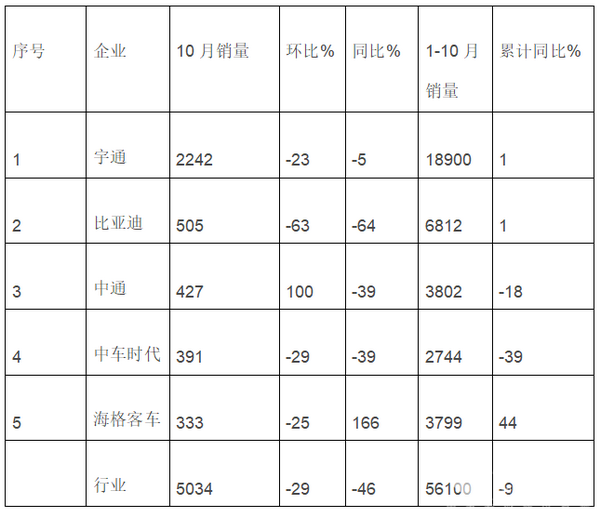 由上表可见,环比上月,销量前五企业1增4降,仅中通客车实现增长;与去年同期相比,五家企业1增4降,排名前四的企业全部遭遇下滑,降幅最大的是比亚迪,达到64%,中通和中车的降幅也双双接近4成。10月份,大客销量前五企业无一实现环比、同比双正增长,宇通、比亚迪和中车时代三家企业还遭遇了环比、同比双降。从累计销量看,1-10月大型客车累计销售5.61万辆,同比累计下降9%,累计增幅从前9月(+5%)陡然转负,具体到10月销量前五企业来看,5家企业3增2降,中通和中车时代已进入下降区间。