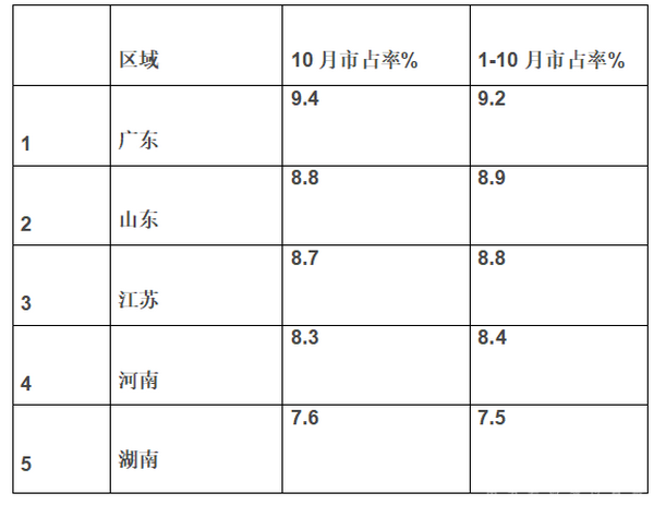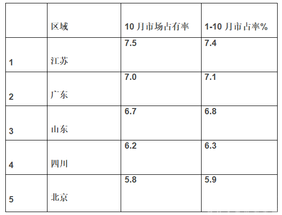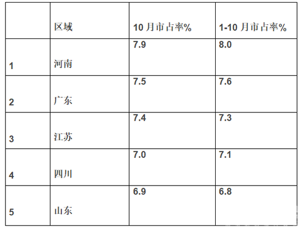 根据上牌信息,2018年10月及1-10月大型客车流向前5名区域市场占有率统计数据表