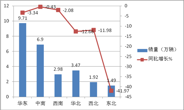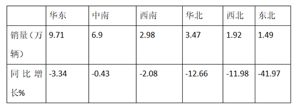 1-10月,华东地区销售9.71万辆,同比下降3.34%;中南地区销售6.90万辆,同比下降0.43%;华北地区销售3.47万辆,同比下降12.66%;西南地区销售2.98万辆,同比下降2.08%;西北地区销售1.92万辆,同比下降11.98%;东北地区销售1.49万辆,同比下降41.97%。