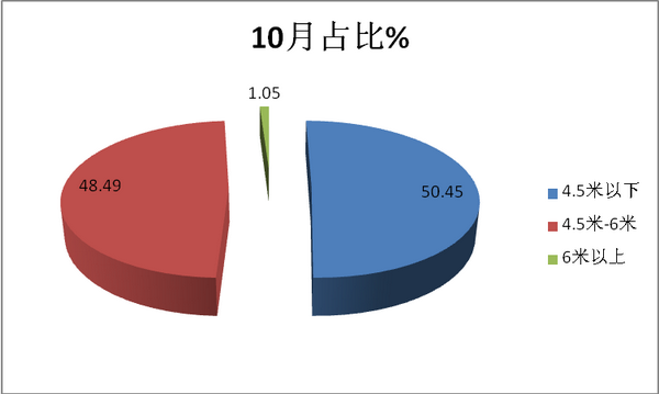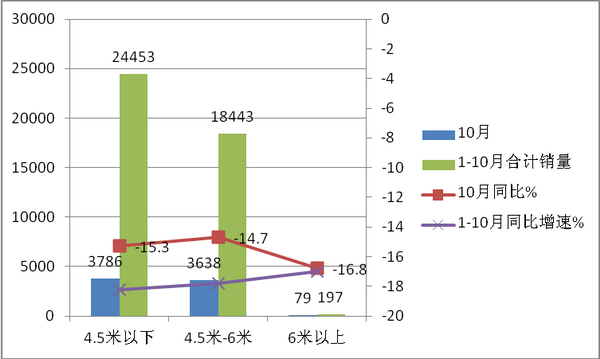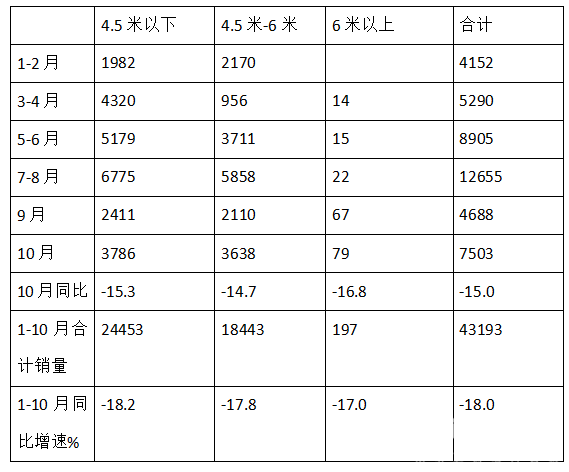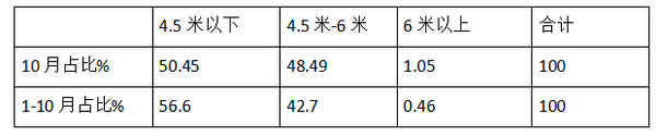 特点一、4.5米以下销量权重最大,6米以上权重最小;10月销量同比下降15%;1-10月累计销量同比下降18%