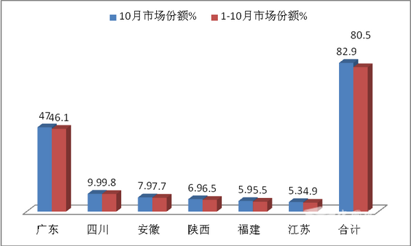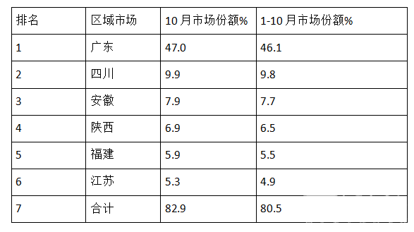 可见,广东是销量最大的区域市场,其次是四川,再次安徽。10月及1-10月前6名销量占据的市场集中度均超过80%,市场垄断程度较高。可见市场分布不均衡。主要与各区域的补贴政策和路权优势等因素有关。