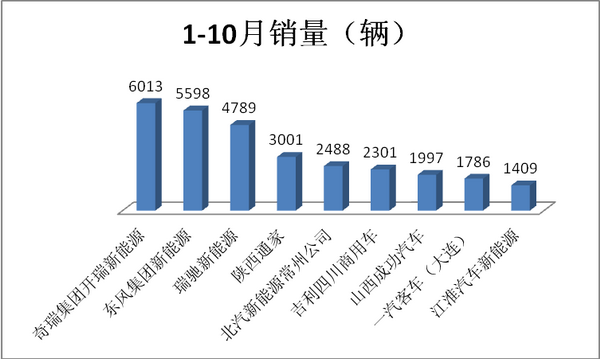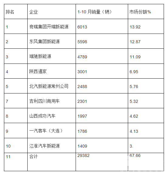 安徽江淮汽车前10月销售电动物流车1409台,占比3.0%,位列排行榜第10位。