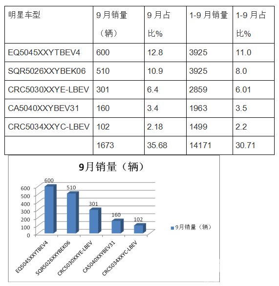 1、9月及1-9月上图表中的前5个纯电动物流车型销量集中度均超过30%。