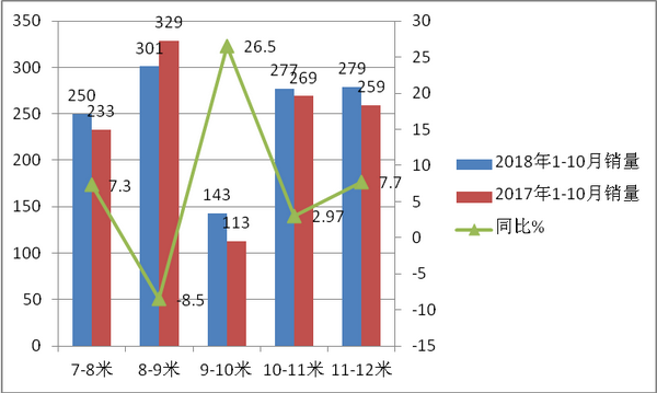 特点一:8-9米销量最多,同比是唯一下降的长度段;9-10米销量最小,同比增幅最大。
