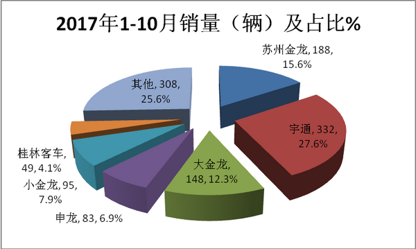 1、2018年1-10月在海南区域旅游客车销量最大的是郑州宇通,其次是苏州金龙,再次是大金龙,第四是小金龙、第五是上海申龙,“四龙一通”是海南旅游客车市场的主流品牌,尤其是宇通客车的市场占有率遥遥领先,处于绝对老大哥地位。