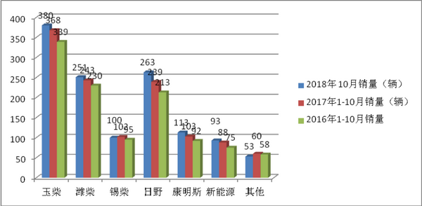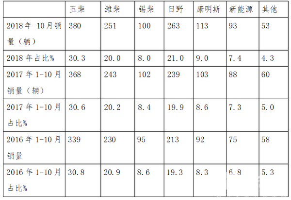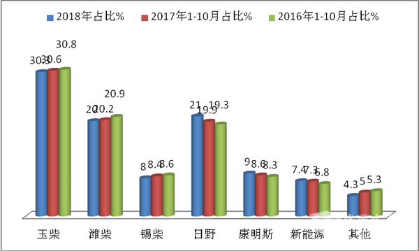 1、2018年1-10月玉柴、潍柴、锡柴等国产动力销量占据了58.3%的主流市场,比2017同期的59.2%比例下降0.9个百分点;而日野、康明斯等进口品牌占据30%的市场份额,比2017年同期的28.5%的市场提高了近1.5个百分点。