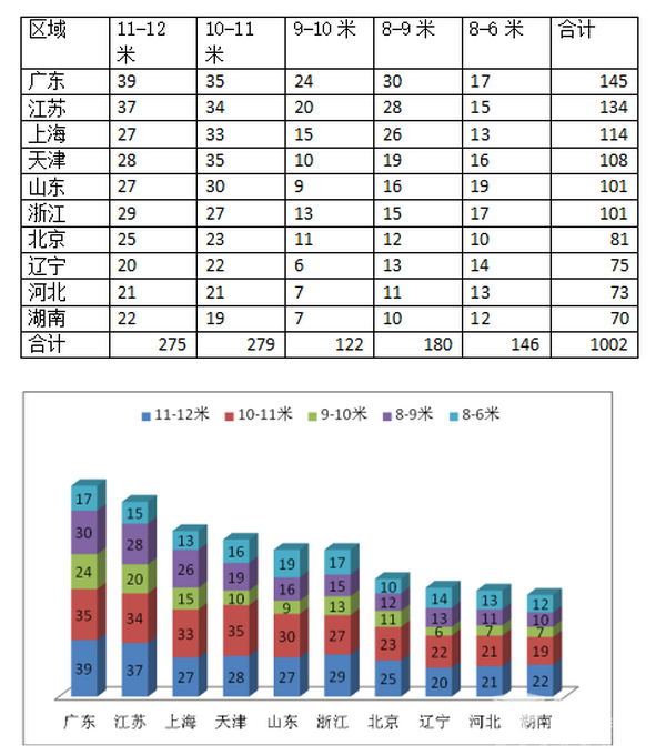 特点三、销量前10名区域中,10-11米团体客车销量占比最大,且同比权重微增