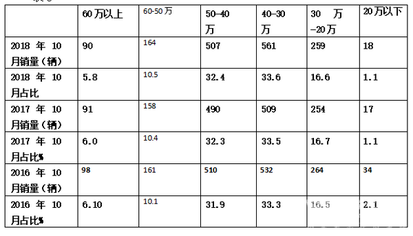 1、2018年10月份60万以上的价格区段的团体车销量和比例次小,比例同比稍微有降低。