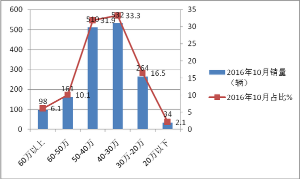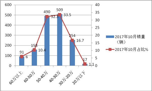特点五:30-40万价格区段权重最大,同比稍有上升;其次是40-50万价格区间,同比基本持平;20万以下价格销量权重最小,同比降幅最大,30-20万区间基本处于稳定态势