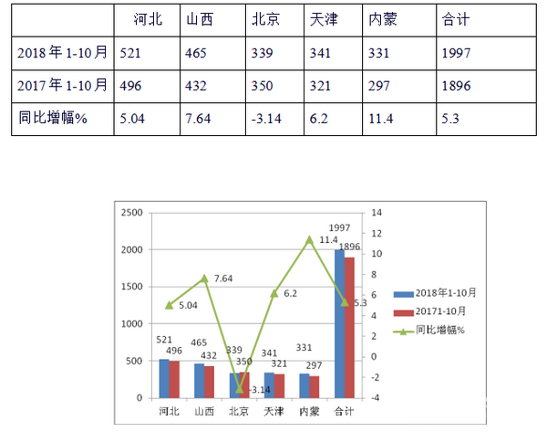 根据最新上牌数据统计,截止2018年前10月,华北区域的河北、山西、北京、天津、内蒙五市场的 10-11米公路客车累计销售1997辆,同比2017年的1896辆增长了5.3%,占据全国10-11米公路客车市场19.4%的比例。