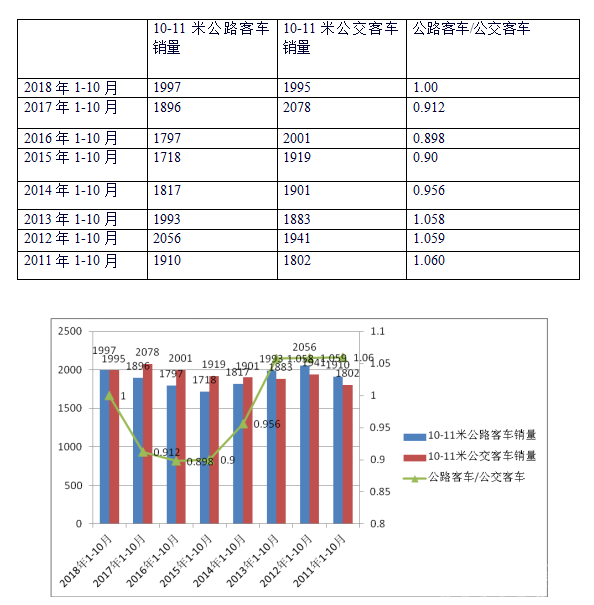 近8年1-10月:10-11米公路客车与公交车的销量比例均在0.898--1.06之间振荡,说明华北五大区域市场10-11米公路客车产品与公交车产品的比例始终保持了一个相对稳定的态势,比例最大的是2011年为1.06,最小的是2016年为0.898。原因大致是: