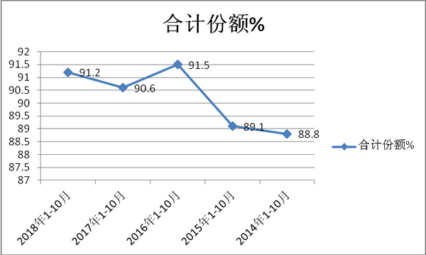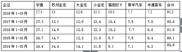 2、2018年1-10月三龙一通、青年、福田、中通等主流公路客车企业的10-11米公路客车总量占据五大区域市场的集中度为91.2%,近年基本稳定在90%左右。