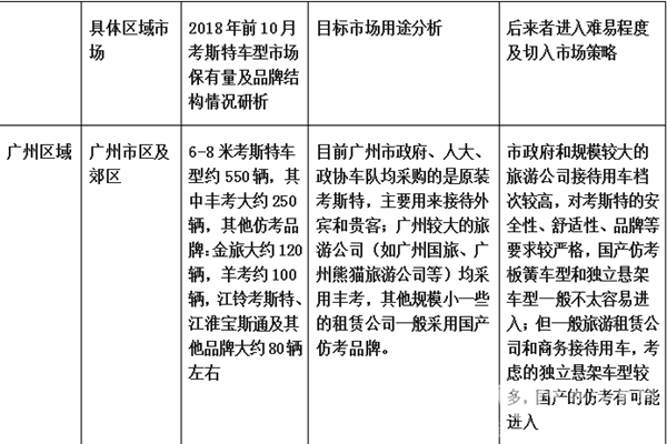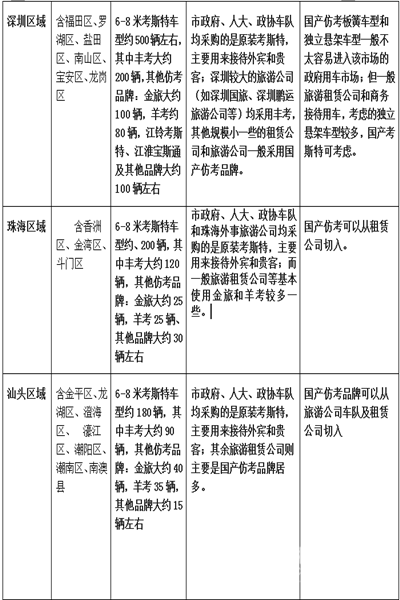 调研得知,广东珠三角区域6-8米考斯特客车目标客户主要是政府机关及事业单位、旅游客运公司、租赁公司、企业班车等,现在将主要市场目前6-8米考斯特品牌垄断程度情况及国产考斯特客车进入各细分市场的策略研析如下: