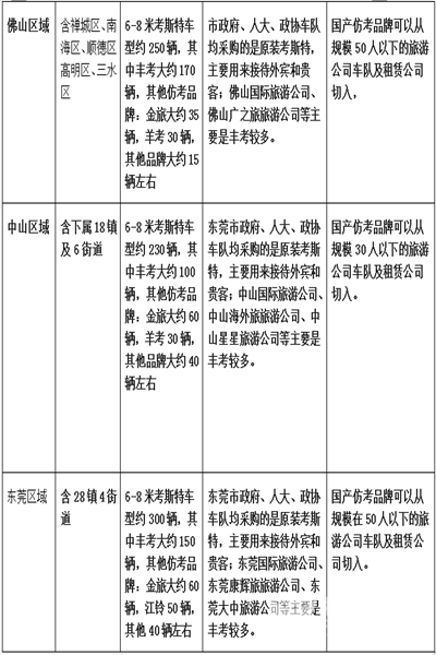 可见,广深地区是珠三角6-8米考斯特拥有最多的区域市场,其次是东莞和佛山等区域。