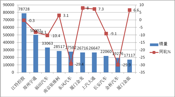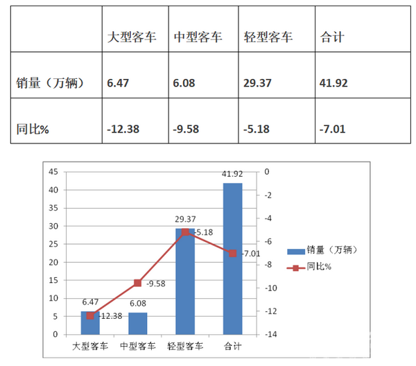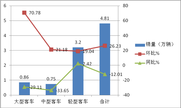 2、客车总体市场同比仍然是下降的,下降的幅度为12.01%,尽管环比增长,但说明客车市场仍然处于低迷状态。
