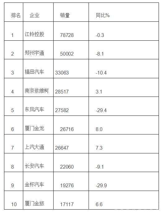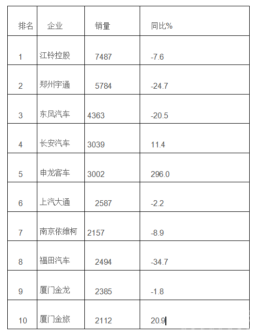 可见,11月客车企业中,江铃控股位居第一,销量达到7487辆,同比下滑7.6%;郑州宇通销量排名次席,销售5784辆,同比下滑24.7%;前十企业中,上海申龙增幅最大,同比增长296.0%。