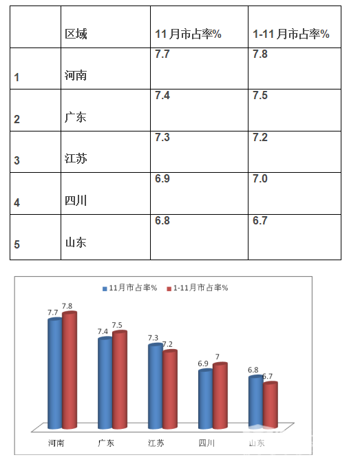 1、根据上牌信息,2018年11月及1-11月大型客车流向前5名区域市场占有率统计数据表