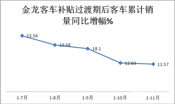 6、新能源补贴过渡期一过,7月到11月,金龙汽车的产销量同比出现明显的下滑趋势,销售同比增幅分别为23.56%、19.68%、18.1%。12.03%、11.57%,原因主要是新能源客车补贴退坡至行业利润“斩半”,各企业包括金龙汽车在内的客车企业开始出现“变形记”。