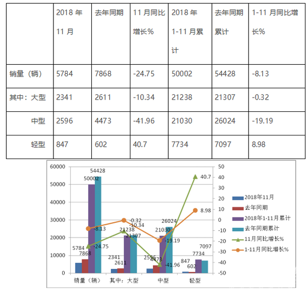 2、2018年1-11月,金龙汽车累计销售大型客车13136辆,同比增长11.57%;累计销售中型客车7367辆,同比增长15.9%;累计销售轻型客车27712辆,同比增长11.55%。