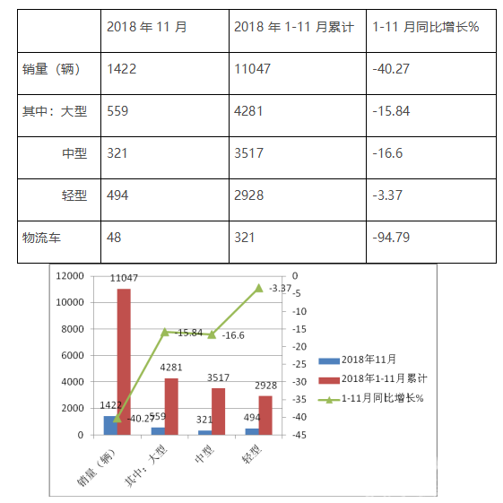 1:11月销量1422辆,1-11月累计销量11047辆,同比下降40.27%,环比降幅扩大近2.44个百分点。