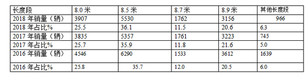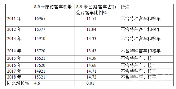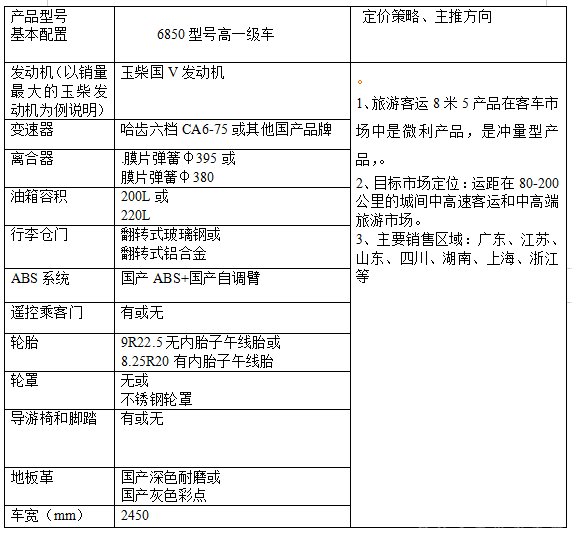 1、根据市场调研可知:在8-9米座位车中,以2018年前11月8米5左右的国产中型高一级车销量为最大(从上面分析可知约占8-9米公路客车销量的三分之一),以此长度段的车型来说明8-9米公路客车的主要配置情况和具有一定的代表性,表6