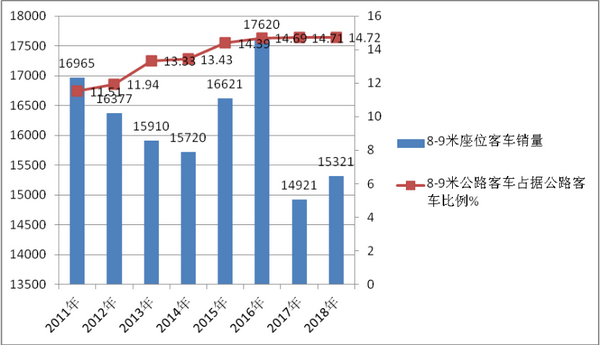 2018年1-11月8-9米公路客车销量同比增长近4.6个百分点,近8年前11月,8-9米公路客车销量占据当年公路客车总量的比例从2011年的11.51%逐年提高到2018年的14.72%,说明8-9米公路客车在公路客车市场中的权重越来越大,但始终没有突破15%,这一规律的揭示给客车企业在开发公路客车市场资源投入方面有了一个明确的启示。