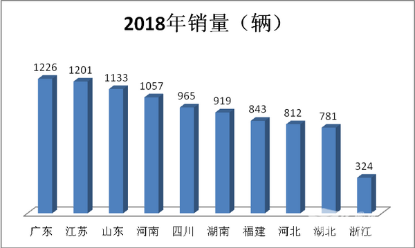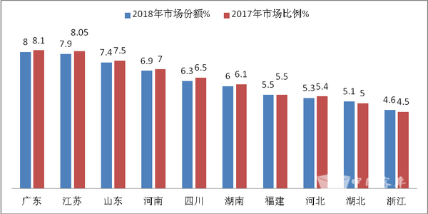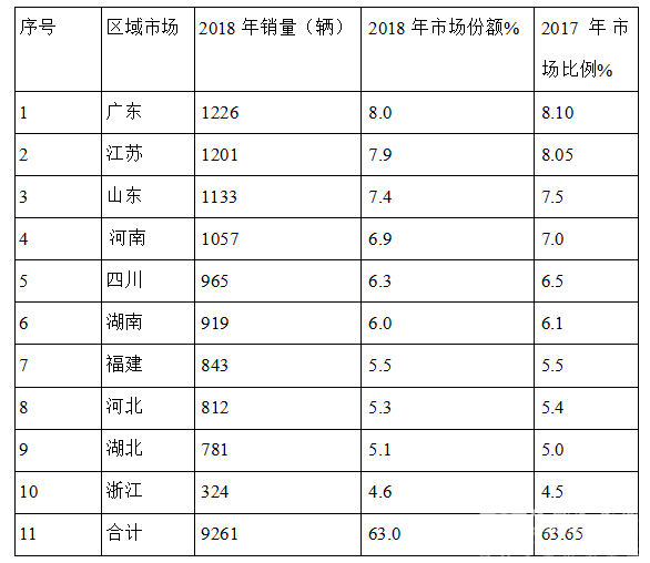 2、8-9米公路客车市场流向分布不均衡,广东、江苏、山东等经济强省(或者人口大省)的市场份额均超过7%,但同比均相应有所下降。