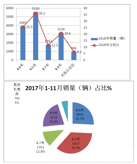 2018年1-11月8-9米长度段公路客车中,8.5米段是销量比例最高的长度段,比例超出三分之一,且与2017年、2016年同期比,有上升趋势;其次是8.0米段,比例为25.5%,且同比有下降迹象;再次是8.9米长度段,销量比例接近20.6%,且同比有下降的趋势。最小比例是8.7米长度段,销量比例接近11.5%,但同比比例有减少的趋势,此项分析,给公路客车企业在8-9米公路客车产品开发的车型定位方面提供了量化参考依据。