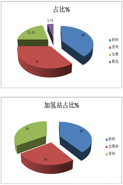 截至2018年11月底,欧洲拥有160座正在运行的加氢站,占全球总数量的40%;亚洲拥有140座,占35%;北美拥有85座,占21.25%。欧洲和亚洲是全球加氢站分布的主要区域。