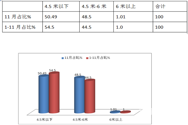 特点一、4.5米以下销量权重最大,6米以上权重最小;11月销量同比下降42%;1-11月累计销量同比下降25%