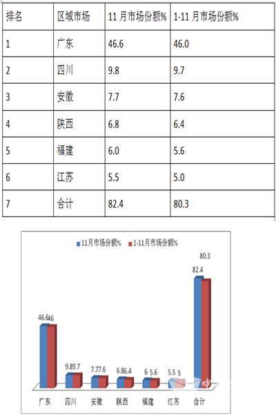 可见,广东是销量最大的区域市场,其次是四川,再次安徽。11月及1-11月前6名销量占据的市场集中度均超过80%,市场垄断程度较高。可见市场分布不均衡。主要与各区域的补贴政策和路权优势等因素有关。