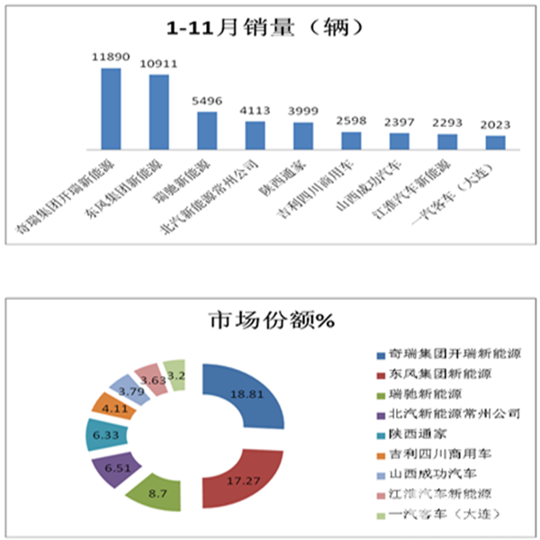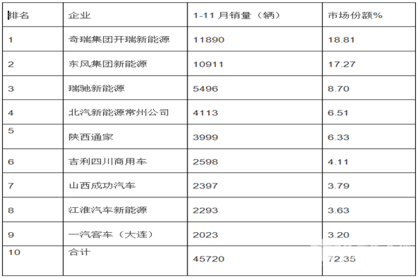 企业方面,奇瑞集团开瑞新能源前11月电动物流车销量达11890辆,夺得冠军宝座,占比达18.8%。东风系位居第二,其前11月电动物流车销量达10911辆,占比17.27%。排在第三位的是瑞驰新能源,其前11月电动物流车产量为5496辆,占比8.7%。以上三家企业占国内前10月电动物流车总销量的近45%。前9名企业的纯电动物流车的市场占有率接近72.5%。垄断程度比上月增长近5个百分点。