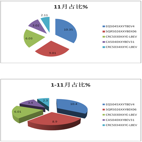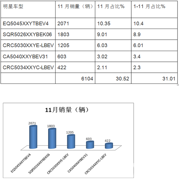 1、11月及1-11月上图表中的前5个纯电动物流车型销量集中度均超过30%。