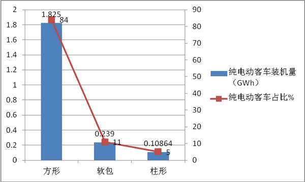 1、 纯电动客车中,方形电池装机量最大,占比达到84%,为最大,其次是软包型,最小的是柱形。