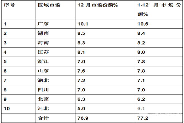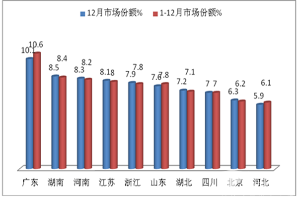 1、12月及1-12月广东、湖南、河南等前10名区域市场份额 均超过75%,区域市场垄断程度可见一斑。