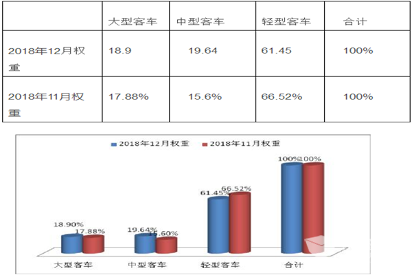 2018年12月,大中轻销量结构中,轻客销量权重环比下降5.06个百分点;大型客车销量权重环比上升1个百分点;中型客车销量权重环比上升近4个百分点。具体原因简析: