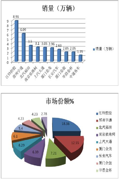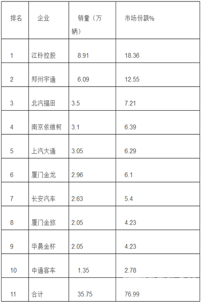 特点四:全年大中轻客车总销量中,江铃汽车占据老大宝座;前10名企业销量35.75万辆,市场集中度为76.99%