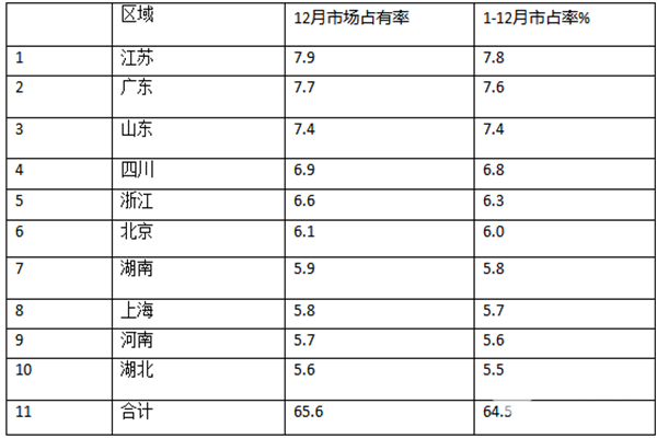 2、根据上牌数据统计计算,2018年12月及1-12月中型客车在重点区域市场的销量占有率---河南区域市场市场占有率最高: