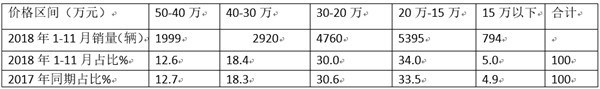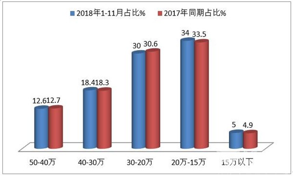 2018年1-11月校车累计销量为15868辆,同比增幅为-20.5%,按价格划分,1-11月校车销量结构为: