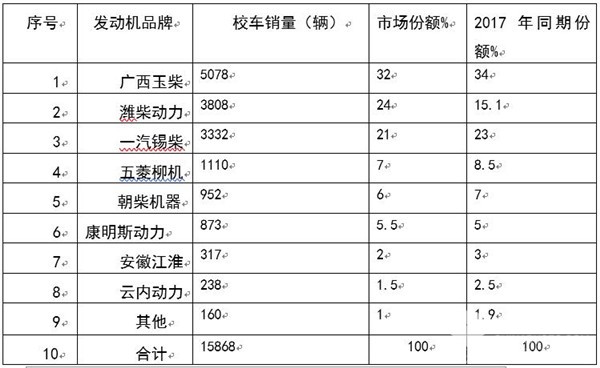按发动机品牌划分,2018年1-11月校车的销量及份额统计表
