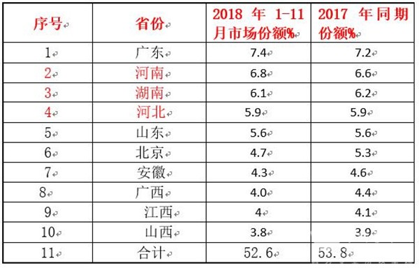 上图表数据表明,2018年1-11月前10个重点区域市场的市场集中度只有52.6%,同比下降了近1.2个百分点,说明同比市场垄断程度有所减弱,说明其他区域市场有所增强。其中广东区域是2018年前11月校车销量最大的市场。
