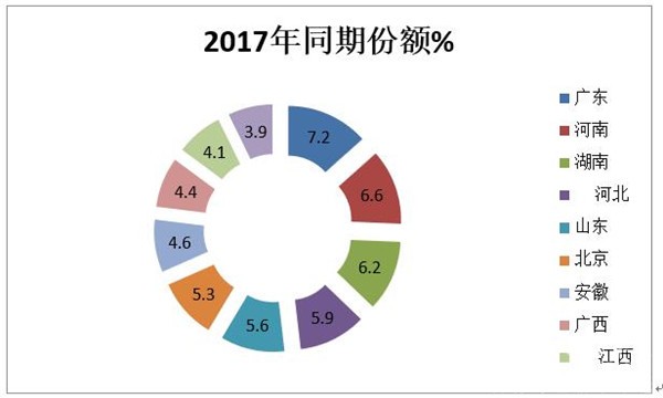 特点四、区域市场流向不平衡;广东是最大的销售区域;前10名重点区域市场集中度同比下降1.2个百分点,垄断程度有所减弱
