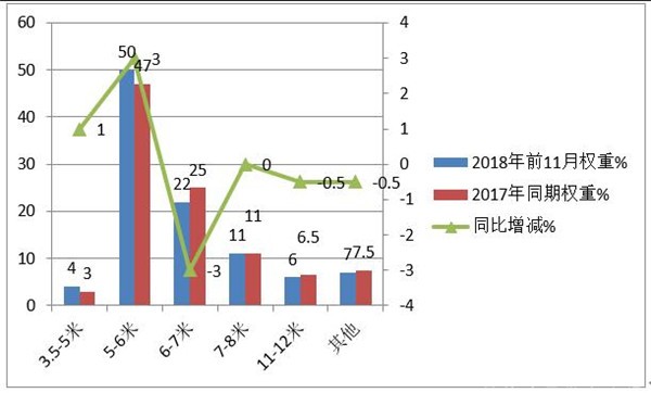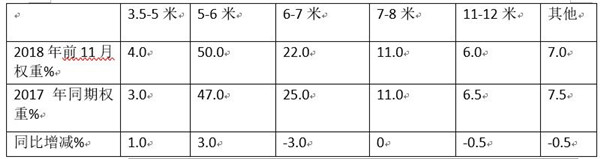 可见,2018年前11月,校车在5-6米占据的权重占据半壁江山,且同比权重增加了3个百分点,为最多。