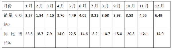 从客车全年月度销量同比变化情况来看,1月销量同比呈较快增长,2月有所下降,3-5月同比均呈增长,6月后月度销量同比呈不同程度下降,四季度降幅更为明显。