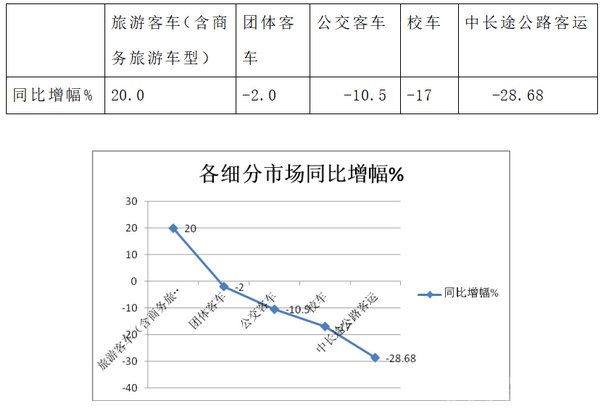 特点三:旅游客车市场(含商务旅游车型)是表现相对较好的唯一细分市场;校车市场表现不佳;往年一直增长的公交市场“风光不再”,同比开始出现下降;中长途公路客车市场“惨淡”