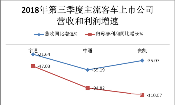 以2018年第三季度为例来说明: 以大客车为主业的客车大佬宇通客车、中通客车、安凯客车等企业普遍表现较为低迷,都无一例外地出现了营收净利双双大幅下滑的情况(宇通营收下滑21.64%,归母净利润下滑47.03%;中通客车营收同比下降55.19%,归母净利润下降94.82%;安凯客车营收同比减少35.07%,归母净利润110.67%